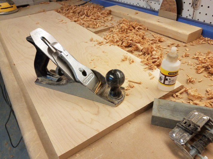 For the panel glue-ups, this was the first time I’d tried hand-planing. What a time-saver this turned out to be. If you are like me, there is always a little bit of a fluctuation in the panel once the clamps come off. Sanding, even with a course grit on the sander, take a lot of time and makes a lot of dust. So I pulled out my Stanley bench plane and sharpened up the blade. With a little tuning here and there, this worked great for flattening out the panel and making the sanding stage much quicker. If I had a wide planer or drum sander, that would’ve been my first choice, but I don’t have that stuff.