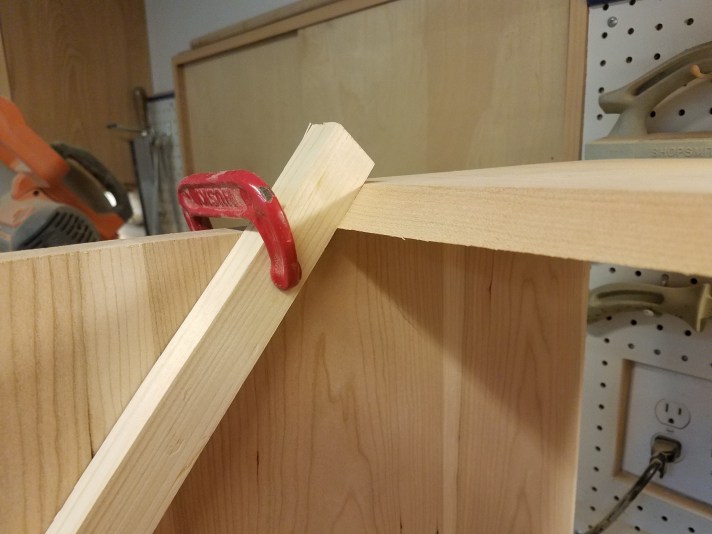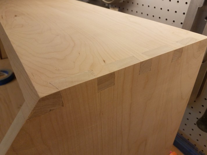It starts like many furniture projects, with some initial glue-ups, some planing, and some sanding. Getting the correct angle for the lid takes a lot of careful measurements, some math skills, paper and pencil, and patience. I dry-assembled the case, and then installed the hinges in place, using a piece of scrap instead of the actual lid. This allowed me to mark the side of the case so I could cut the correct angle, and it also helped me establish the angle to cut the edge along the top of the desk. It isn’t perfect, but if I ever make a second one of these, I think I’d have this sucker licked!